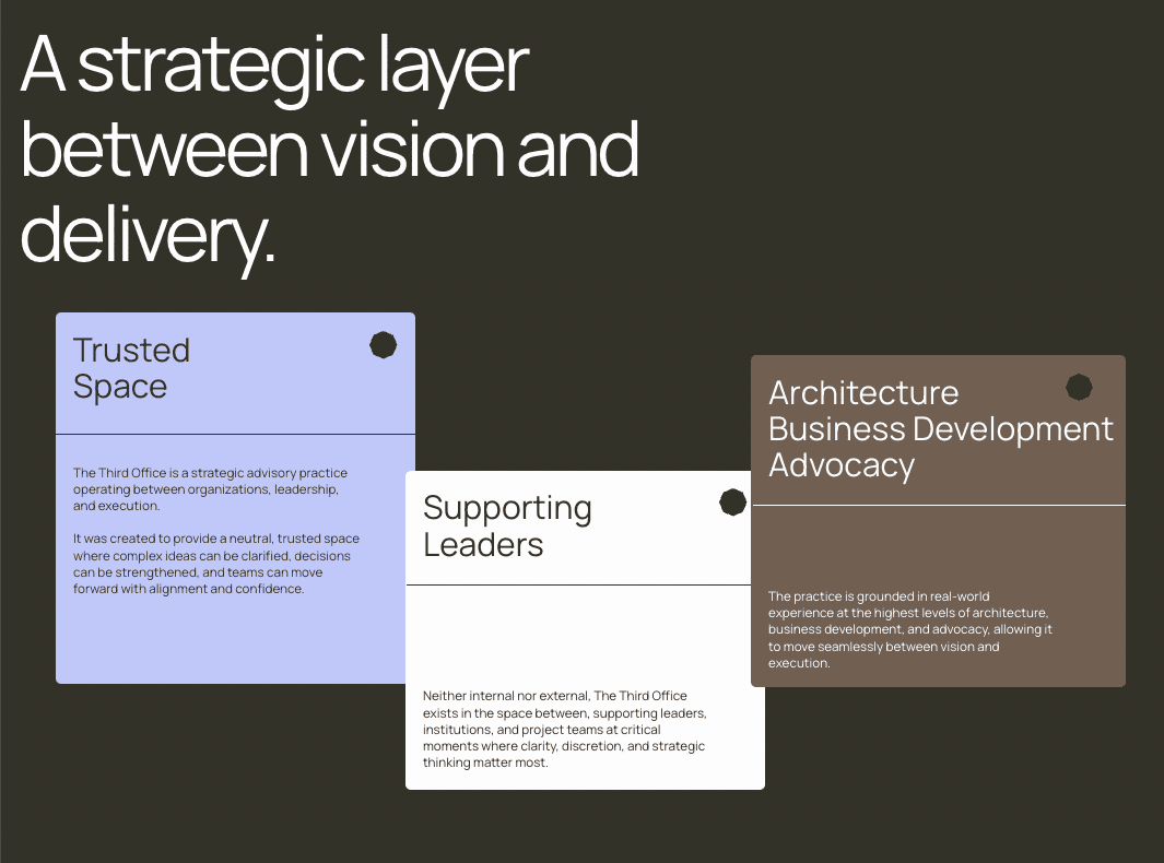 The Third Office is now live. https://www.thethirdoffice.com I invite you to explore the work and consider how this model might support your practice or organization. If there is alignment, I would be glad to connect.